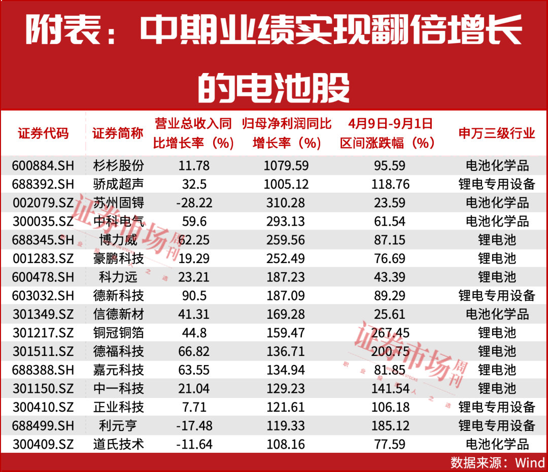 在归母净利润实现同比增长公司中,杉杉股份(维权)、骄成超声、中科电气、博力威等16家公司实现利润翻倍增长。其中,杉杉股份、骄成超声今年中期归母净利润同比增长了1079.59%、1005.12%。