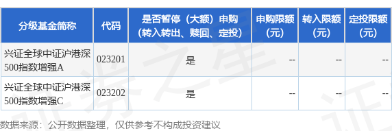 本站消息,10月27日兴证全球基金管理有限公司发布《兴证全球中证沪港深500指数增强型证券投资基金暂停申购(含定投)、赎回、转换业务的公告》。公告中提示,为非港股通交易日,自2025年10月29日起兴证全球中证沪港深500指数增强型证券投资基金暂停申购(含定投)、赎回、转换业务,下属分级基金调整明细如下: